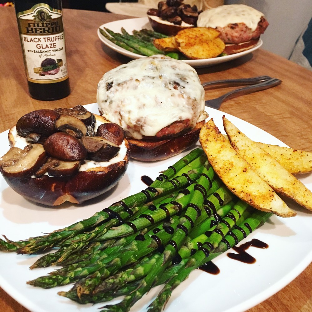 Swiss & Mushroom Burgers w/ Black Truffle Balsamic Asparagus ๐๐ป Itโs amazing how a little drizzle of balsamic can really boost the flavor! I have been obsessed with @filippoberio_us โs Classic balsamic glaze for a while now, and I just recently ventured into trying out all the different flavors. The black truffle balsamic (pictured here) and the raspberry are my favorites so far! ๐ด#filippoberio #balsamic #asparagus #burger #swiss #mushrooms #EVOO #italian