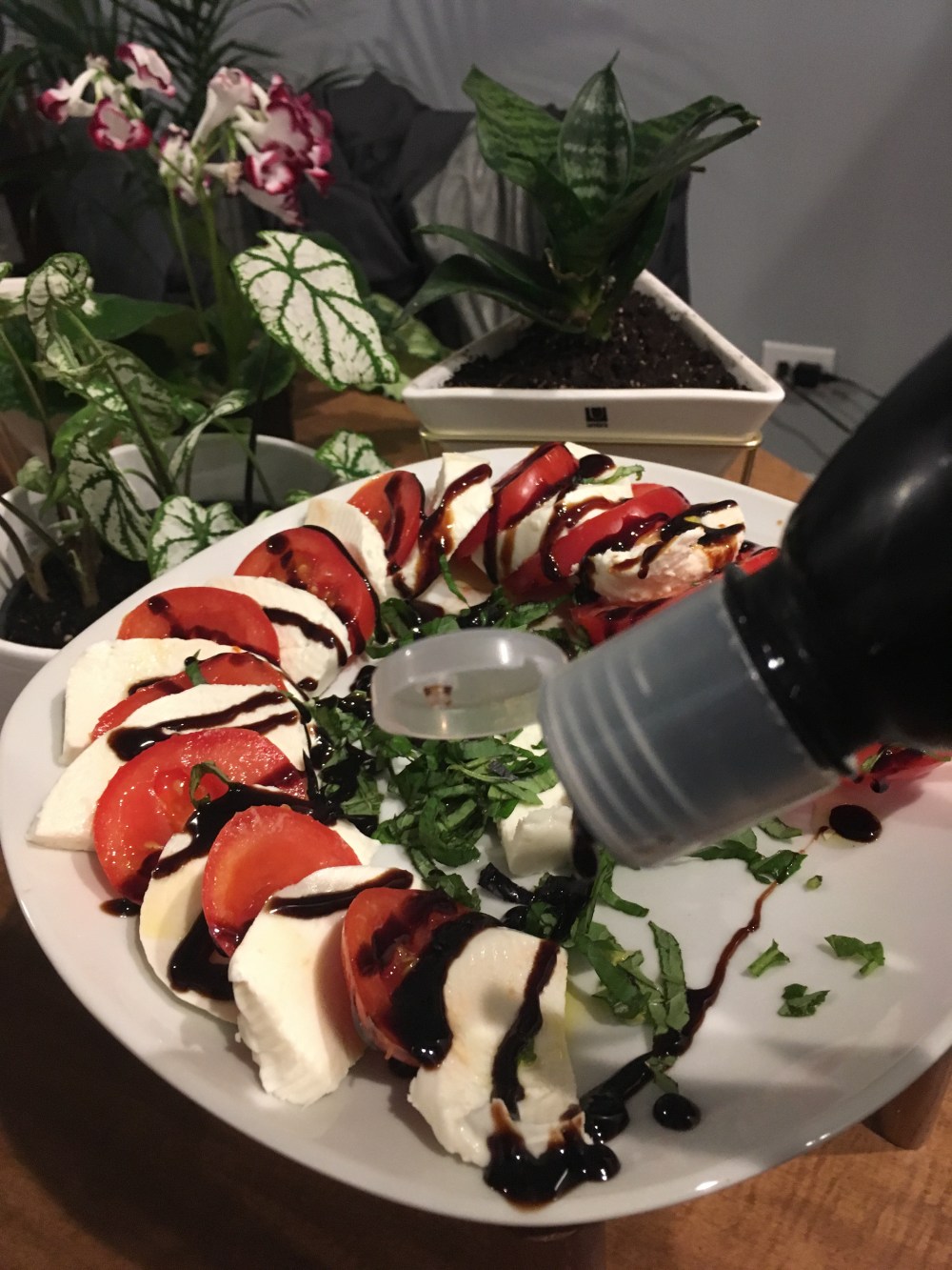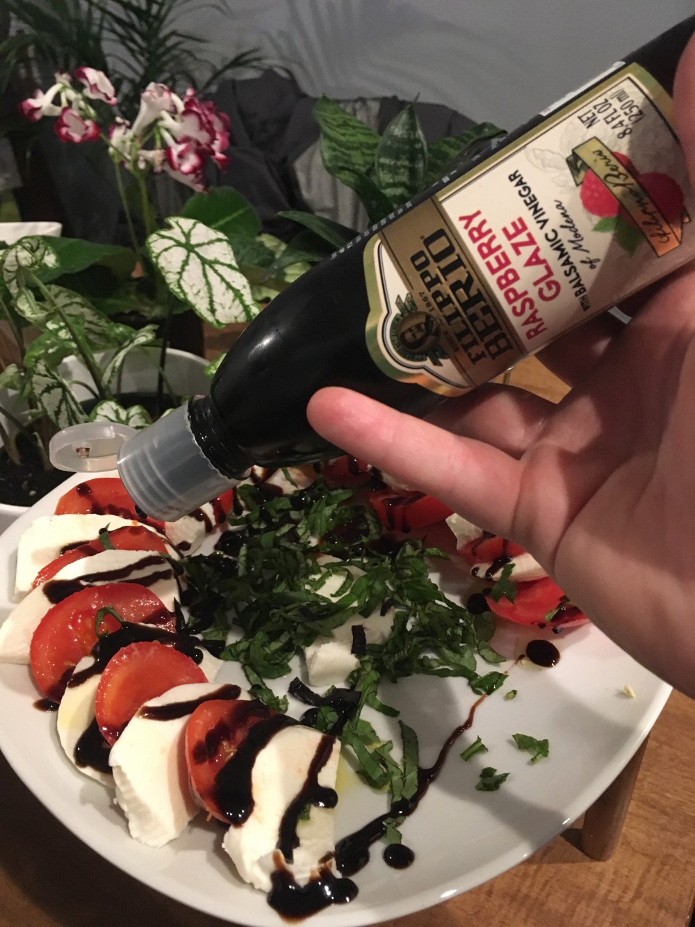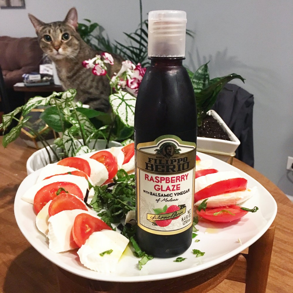 As I drizzle some delicious balsamic glaze on my #caprese , I’m reminded that I’m not the only one in the house obsessed with @filippoberio_us products 😂. Peep echo in the background just waiting for me to turn my back lol. For this recipe I used: