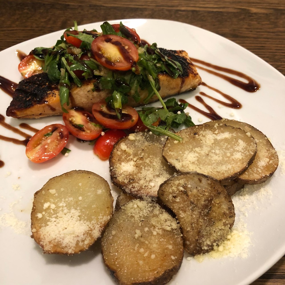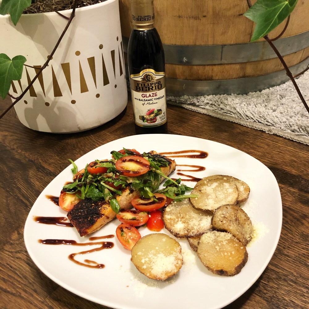 A little balsamic goes a long way – especially when it’s @filippoberio_us . ☺️ We added a little extra char to this salmon before topping it with arugula, tomato, and #filippoberio olive oil, and then finished off with a touch of sweetness by adding a drizzle of balsamic glaze. Simply the best. #oliveoil #balsamic #balsamicglaze #salmon #recipe #dinner #ad